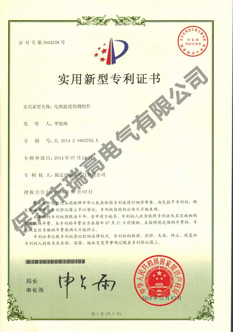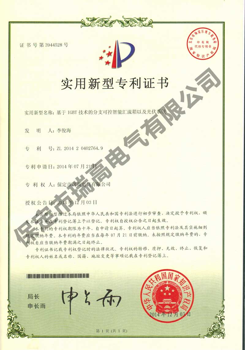 職業(yè)健康安全管理體系認證證書職業(yè)健康安全管理體系認證證書質量體系認證證書質量體系認證證書電池溫度檢測組件電池溫度檢測組件放電間隙放電間隙基于IGBT技術的分支可控智能匯流箱以及光伏系統基于IGBT技術的分支可控智能匯流箱以及光伏系統新型智能型變壓器風冷控制柜實用新型專利證書新型智能型變壓器風冷控制柜實用新型專利證書箱變智能監(jiān)控系統箱變智能監(jiān)控系統智能泄露電流監(jiān)測傳感裝置以及泄露電流監(jiān)測系統智能泄露電流監(jiān)測傳感裝置以及泄露電流監(jiān)測系統